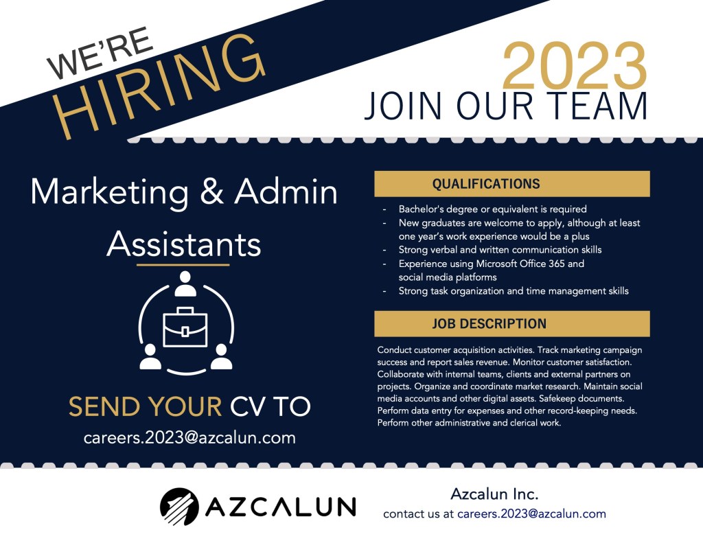 We’re hiring Marketing and Administrative Assistants! Posted on August 29, 2023October 9, 2023 by azcalun Share this: Share on X (Opens in new window) X Share on Facebook (Opens in new window) Facebook Like Loading...